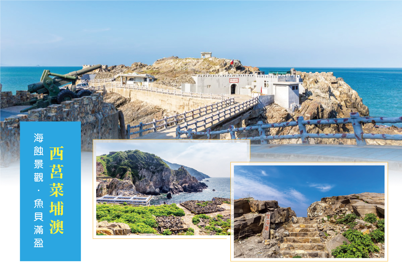【菜埔澳地質公園-陸連島】菜埔澳位於西莒島東北方,隸屬於田沃村,據說乃因澳口盛產紫菜而得名。每到產季,沿海一塊屬於陳將軍廟的大石,便會開放競標,得標者才有權利採集石塊上的紫菜,也算是馬祖一個相當特別的風俗民情。