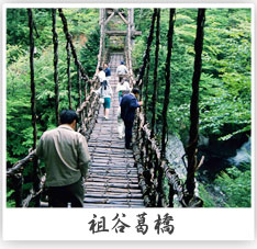 【冒險刺激~祖谷葛藤橋】日本國家和德島縣的重要有形民俗文化財產,又名【蔓橋】橋長45公尺、寬2公尺、高15公尺,是由葛籐編造而成的,渡橋時搖搖擺擺,驚險無比。據傳說在戰爭中失敗的平氏族人而藏身於祖谷溪而為了逃避源氏的追剎因而搭建隨時可以斬斷追兵去路的葛製吊橋,為了安全上的考量每三年將會更換一次藤葛以供遊客前遊玩觀賞,採由北至南單向通行的渡橋方式,步行時的晃動再加上橋下清晰可見的溪流,令人震撼不已。