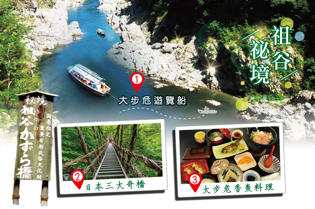 【秘境祖谷溪】素有日本三大秘境美稱,也是米其林綠色指南的星級推薦旅行地跟美國著名旅遊雜誌「Travel+Leisure」選出的 50 個最佳旅行地點。因吉野川上游支流的「祖谷溪」流經了四國的山脈,而形成天然的秘境溪谷,祖谷川河水充沛、河床寬大,兩岸的高山斷崖連綿聳立,初夏時節的新綠或是深秋時的紅葉天,更添剛中帶柔的壯麗;同時也因為地形而切割出令人讚嘆不已的小步危大步危峽谷奇景。