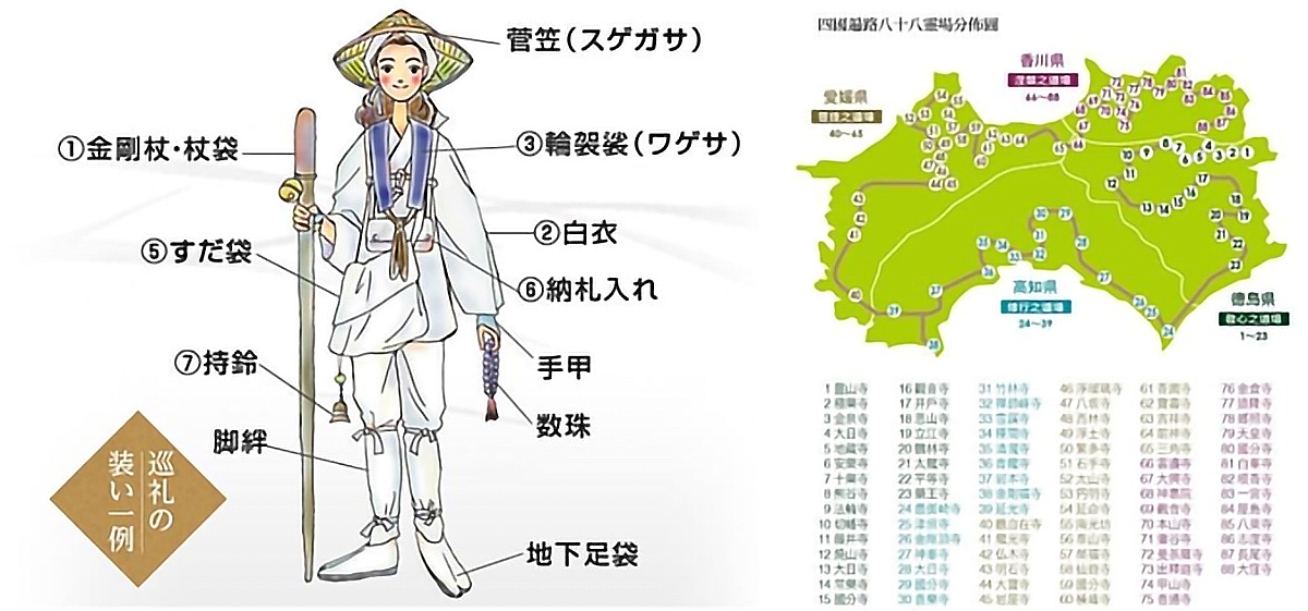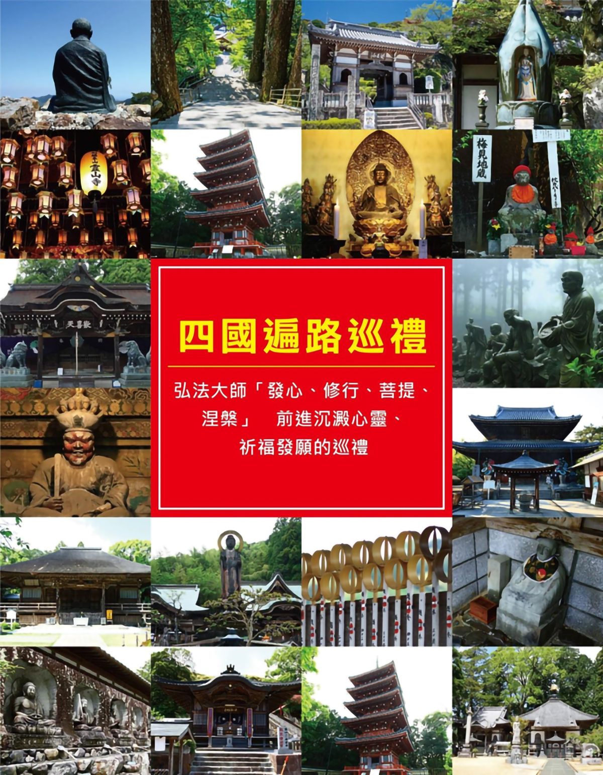 日本真言宗開山僧者——遍照金剛弘法大師(空海)有關的寺院場所,從第一座靈山寺至第八十八座大窪寺,沿途代表了「發心、修行、菩提、涅槃」四個階段。從心重新檢視自己的道路出發,尋求悟道與心靈的昇華,遍路是為沈澱心靈、祈福發願的巡禮。四國 88 寺朝聖之旅傳統稱呼為「遍路」,指的是巡訪約 1,200 年前,空海曾經修行過的八十八座四國靈場的路線。空海諡號「弘法大師」,是真言宗的開宗祖師,並於佛教聖地高野山建立了真言宗總本山寺院「金剛峯寺」。